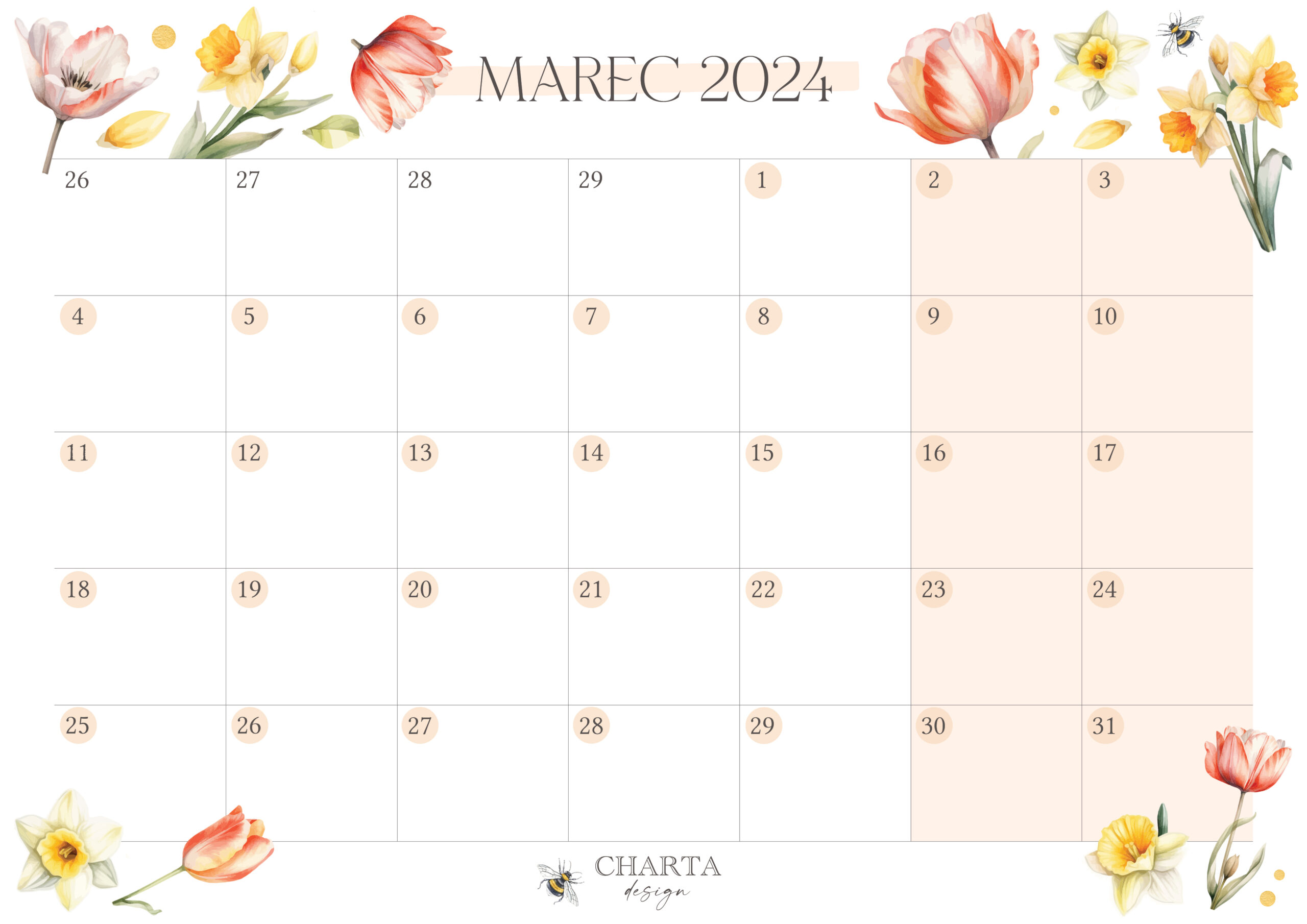 Myslím, že zimy už naozaj stačilo a väčšina z nás sa nevie dočkať slnečných, teplých dní. ☀️ Poďte si ich naplánovať do sviežeho marcového plánovača v dizajne jarných kvetín. 🌷 Nech už vás čakajú akékoľvek povinnosti alebo radosti, s týmto jednoduchým prehľadom už na nič nezabudnete. 😊